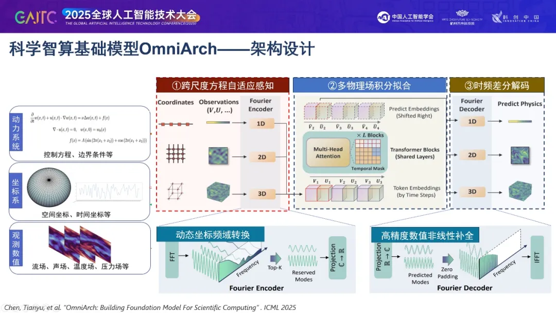 以GPT-4为代表的基础模型,彻底变革了语言处理、图像理解与跨模态生成等领域,同时也在向人类智慧的最高结晶“科学研究”发起冲击。例如千禧年问题NS方程如何进行人工智能科学计算求解,是否存在类似于基础模型的Scaling law?北京航空航天大学计算机学院助理教授孙庆赟团队提出了基于MindSpore的面向科学智算的基础模型OmniArch,首个旨在解决多尺度和多物理科学计算问题的基础模型原型,通过全新设计的统一架构解决了问题尺度、物理量、物理规律的三方面难对齐的挑战。该模型在国际基准PDEBench上完成了1D-2D-3D的联合预训练,展现出了较强的上下文学习能力,特别是零样本推理带来了全新物理发现的可能。