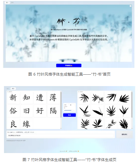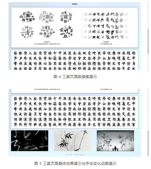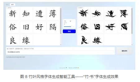 校企共建可线上体验的竹叶风格字体生成智能工具——“竹·书”。该工具打通了从AI训练字体风格模型到公众交互体验的完整链路,实现了人工智能生成字体的可视化、参数化与定制化。用户通过输入任意诗文文字,体验以文字输入驱动生成的过程,并可调节具体的训练步数,以呈现“竹叶体”在不同推理阶段的生成效果,显著提升了汉字字体设计的参与性与趣味性。该工具不仅具备创新的美学探索潜力,也在工作坊教学应用与公共传播中展现出良好的实践价值。
