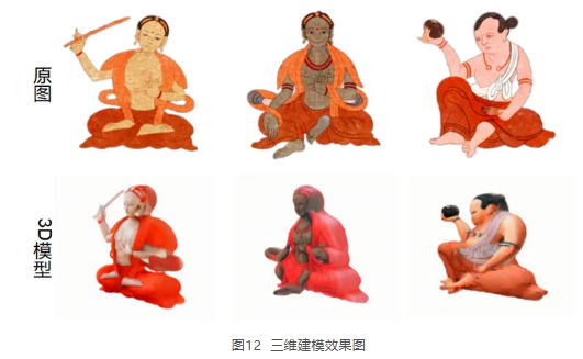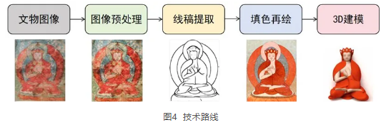 突破了传统数字化修复技术的局限性,提出了高质量的线稿提取方法,通过交互为生成最终线稿图提供更大的灵活性和准确性,最大限度地还原经图的结构和细节;提出了可控的填色再绘方法,根据原图和线稿自动生成经图风格图像;提出了从2D到3D 的转换方法,通过3D模型展示经图中的历史人物和宗教故事,提供更深入的文化体验等。以上举措为文物保护和修复工作提供了有效技术支持。
