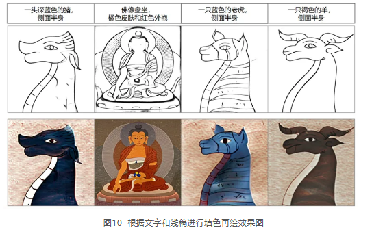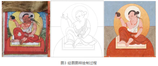修复经图成为迫切需解决的难题,目前川西南地区纸本经图的修复工作主要采用人工手段,通过以下三个步骤进行:(1)文化识别:尽可能识别其身份含义,对于缺失严重的图样需寻找对应的文化元素进行重绘;(2)线稿绘制:根据原作和其他参考资料进行线稿绘制;(3)填色与再制:根据原作进行填色与再制,最终形成数字化经图。