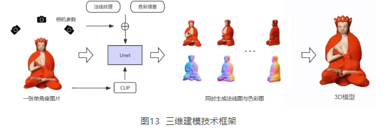 本案例在三维重建技术的基础上,引入了生成式扩散模型。借助图生图大模型,能够通过单张平面图生成该物体多个角度的法线图与色彩图,进一步完成对物体的建模。相较于手工建模,该方法将二维和三维技术相结合,在快速生成模型的同时,保证了三维物体的高质量细节与正确的色彩贴图。