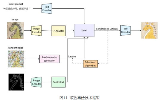 本案例基于扩散模型的加噪和去噪特性,利用文生图大模型Stable Diffusion强大的图像生成能力,并结合LoRA、ControlNet和IP-Adapter等技术,提出了一种高效且低参数的纸本经图填色再绘方法,可以将提取到的线稿进行上色,得到最终的数字化图像,有效解决了风格不一致、佛像姿态变形和颜色失真等问题,显著提升了数字化生成任务的效率和精度。