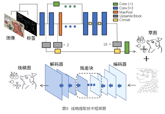 线稿图在数字化图像修复中提供结构信息,使修复人员能够更加准确地绘制缺失的细节和元素。提取线稿的核心难点是寻找“准确度”与“风格化”之间的平衡,本技术希望充分利用人工线稿作为先验知识,提出了将边缘检测与风格迁移相结合的方式。第一步,边缘检测得到粗略的线条,定义为草图;第二步,风格迁移得到理想线条,定义为线稿图。如果原图的部分内容已经丢失,不能检测到线条,也可以通过人工交互的方式去进行辅助修改,无需重新训练模型,简单有效。这种交互性的方法为生成最终线稿图提供了更大的灵活性和准确性,有利于最大限度地还原经图的结构和细节。