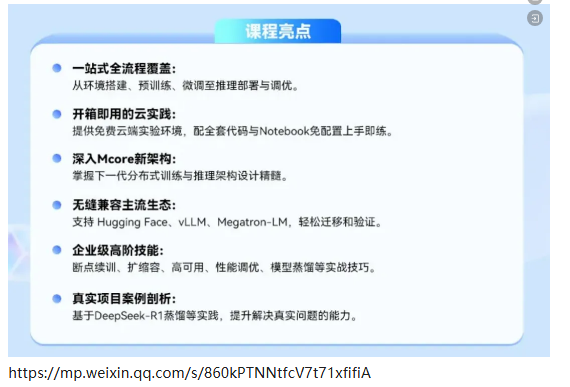 MindSpore大模型全流程应用系列课程,是基于MindSpore Transfoemers打造的大模型课程。本课程带你从0到1完成预训练、微调、推理部署与高阶调优,并提供开箱即用的云端实验环境,无缝支持Hugging Face/vLLM/Megatron-LM生态融合。