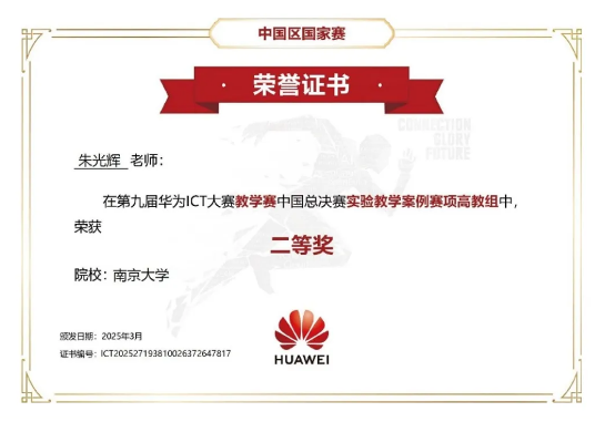 除此之外,朱光辉老师也参与到了第九届华为ICT大赛教学赛中,凭借“基于昇思MindSpore和Transformer的武侠小说续写模型训练与推理”的优质教学实践案例,荣获中国总决赛实验教学案例赛项高教组二等奖。