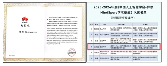 除了教学工作以外,朱光辉老师也参与到了诸多科研的合作中来。其中,“大模型多维度混合并行策略的自动搜索方法”荣获华为“难题揭榜”火花奖;“基于MindSpore的大模型高效并行推理策略研究与设计”荣获CAAI-MindSpore学术基金,目前项目正在推进中。