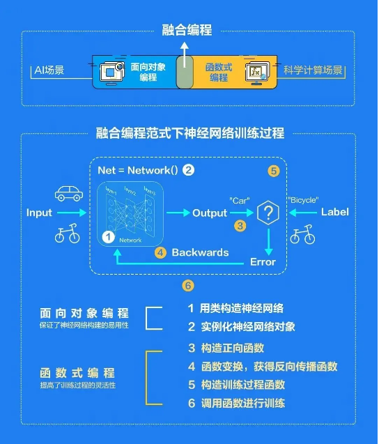 AI应用的实现需要定义神经网络结构、训练神经网络、部署与推理……而神经网络的定义过程与面向对象编程高度契合,大规模的训练过程需要函数式编程的灵活性和准确性。这一系列复杂的过程,使得很难用同一套编程范式兼顾每一步。