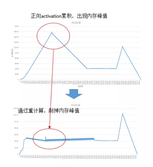 重计算 (Rematerialization) 针对正向算子的输出累计保存在内存中,导致内存峰值过大的问题,舍弃了部分正向算子的输出,而是在反向阶段用到时再重新计算一遍。这样做有效地降低了训练过程中的内存使用峰值。如下图所示,第一个内存峰值通过重计算消除,第二个内存峰值可以通过前面讲到的优化器并行消除。
