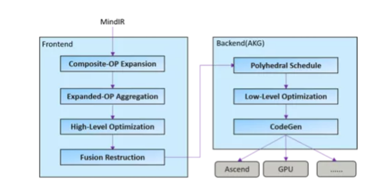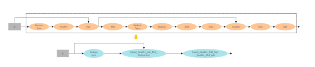 为了提升硬件利用率,MindSpore 使用了图算融合优化技术,通过图层和算子层联合优化,并将「用户使用角度的易用性算子」进行重组融合,然后转换为「硬件执行角度的高性能算子」,从而充分提升硬件资源利用率,进而提升整网执行性能。具体优化流程如下图所示: