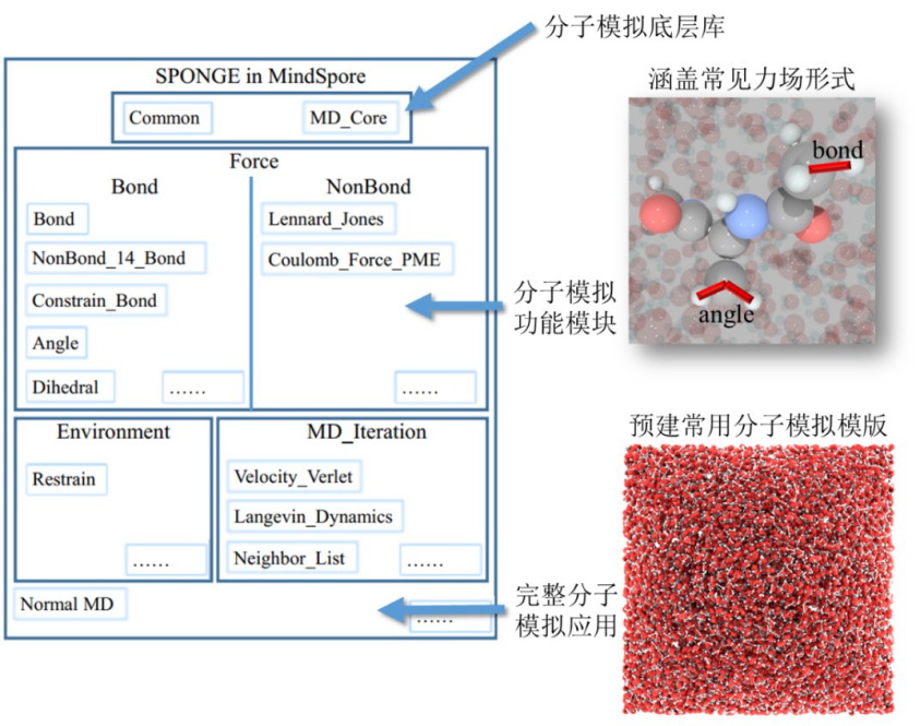 MindSpore1.2 版本开源的 SPONGE 具备两方面优势,一是全模块化分子模拟,二是传统分子模拟与 MindSpore 结合的人工智能算法的全流程实现。全算子化的 SPONGE 将与 MindSpore 进一步结合成为新一代端到端可微的分子模拟软件,实现人工智能与分子模拟的自然融合。