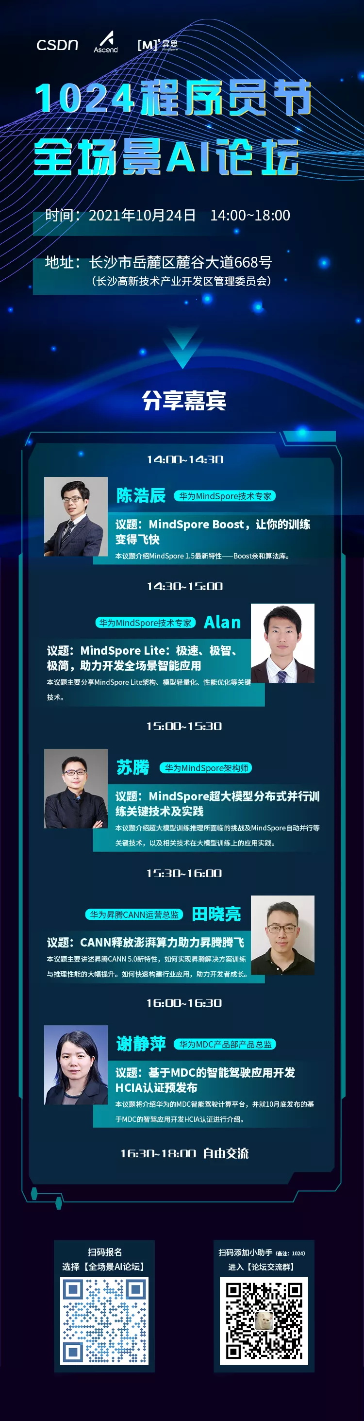 10月24日14:00全场景AI论坛邀请了华为MindSpore技术专家陈浩辰;华为MindSpore技术专家Alan;华为MindSpore架构师苏腾;华为昇腾CANN运营总监田晓亮;华为MDC产品部产品总监谢静萍一起与大家分享MindSpore 1.5关键特性,大规模并行、MindSpore Lite、MindBoost,以及昇腾CANN 5.0新特性和华为的MDC智能驾驶计算平台等精彩内容,期待与大咖老师一起探索AI技术趋势发展!