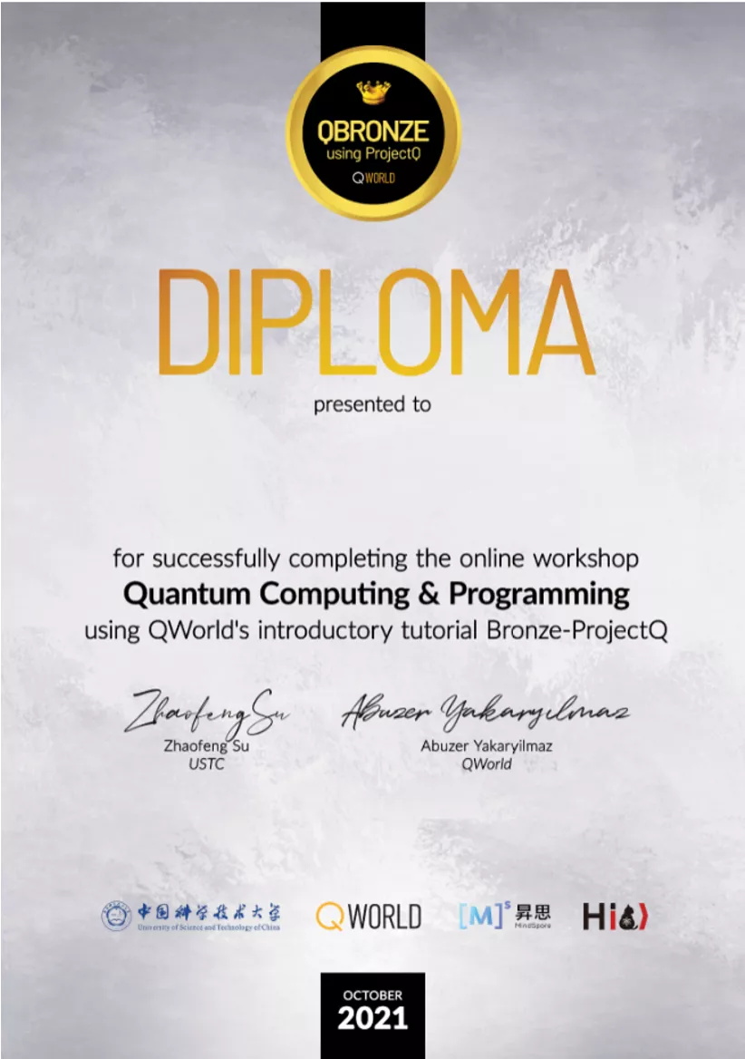 QWorld量子计算基础编程培训活动由中国科学技术大学主办,开源组织QWorld、MindSpore及HiQ量子计算团队联合举办。此次培训是QWorld在中国首次举办、也是第一次使用Bronze-ProjectQ的培训。中国科学技术大学负责学员报名和培训支撑工作,共邀请196名符合要求的学员参加。整个培训共六次课程,持续三周,每周两次。前面五次培训采用全英文线上教学,每位学员不仅要参加在线课程学习,还要完成五项课后作业,并通过QWorld的Canvas系统提交作业和查询分数。培训最后一天的特别讲座是由MindQuantum团队的专家——徐旭升博士带来精彩的量子计算实操课程讲解。MindQuantum是基于昇思MindSpore开源深度学习框架和HiQ量子计算云平台开发的通用量子计算框架,支持多种量子神经网络的训练和推理。