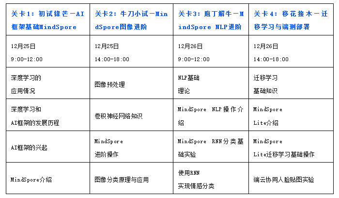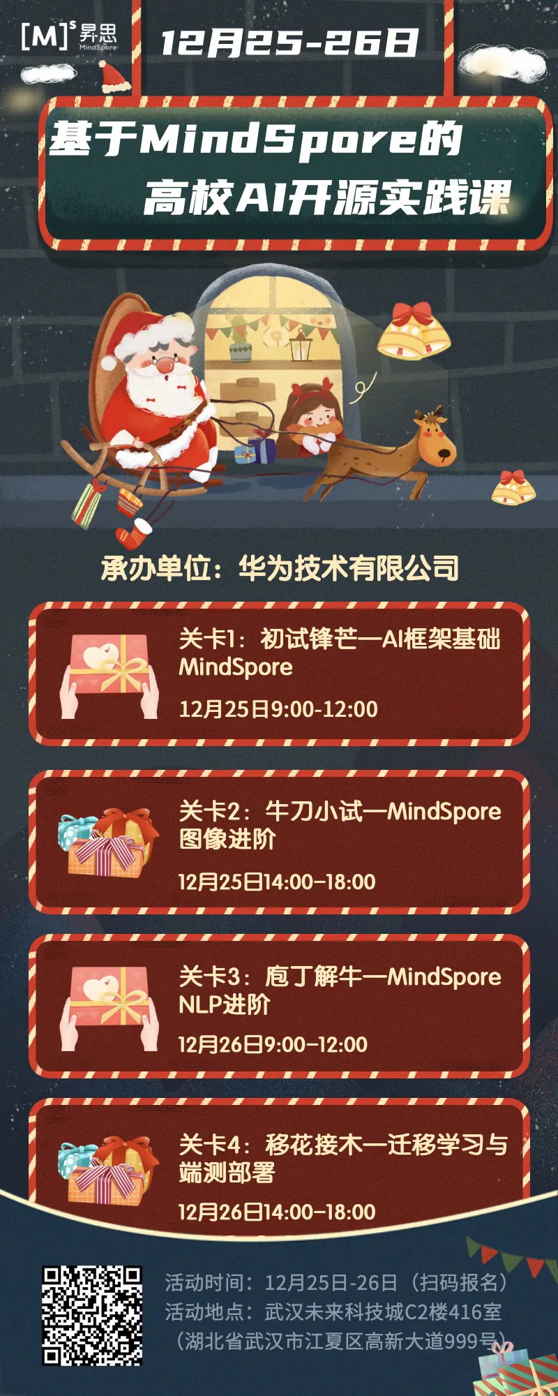 由信息技术新工科产学研联盟主办,华为技术有限公司承办**“基于昇思MindSpore高校AI开源实践课”将于2021年12月25日至26日在武汉举行,旨在为广大教师提供AI实践课程的授课支持,解决高校教师AI课程的实践问题。**