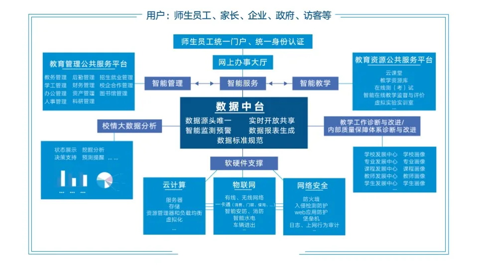 基于该解决方案,实现了校园信息化应用领域全覆盖、过程全监控、人员全参与,利用大数据实现教育教学和管理的精细化、个性化和智能化,不断增强师生信息化获得感,依托智能化校园有效地支撑学校内部质量保证体系诊断与改进,支撑全员、全方位、全过程育人,不断提高学校人才培养质量。