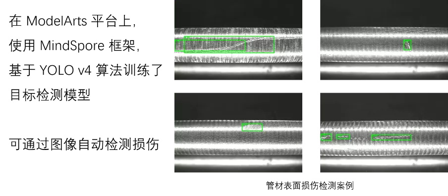 南京仁面在加入MindSpore社区后,基于MindSpore框架自主研发出自动检测金属管材表面损伤的装置,通过环绕管材的多个摄像头来采集图像数据,再传入预先使用MindSpore框架训练的YOLOv4模型来进行目标检测,可自动发现管材表面存在的划痕、凹陷等损伤,并在发现后输出信号以供后续处理。