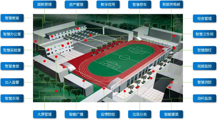 基于该解决方案,通过可视化手段,建设和对接校园各大智慧化管理系统,将各项关键数据和功能模块进行综合化展现、管理,在现有物联平台完善的功能模块下实现三维可视化效果,进一步提升平台应用感观体验。智慧校园可视化设计包括校园地理信息可视化、基础设施管理可视化及校园资源管理可视化三大块设计内容。
