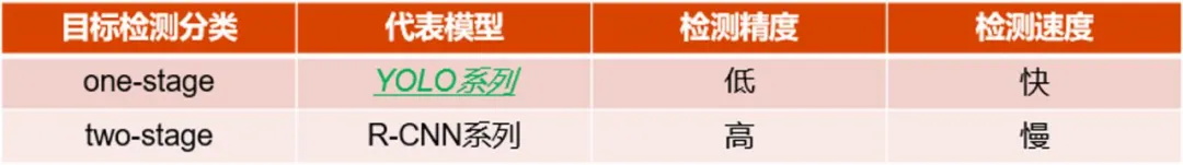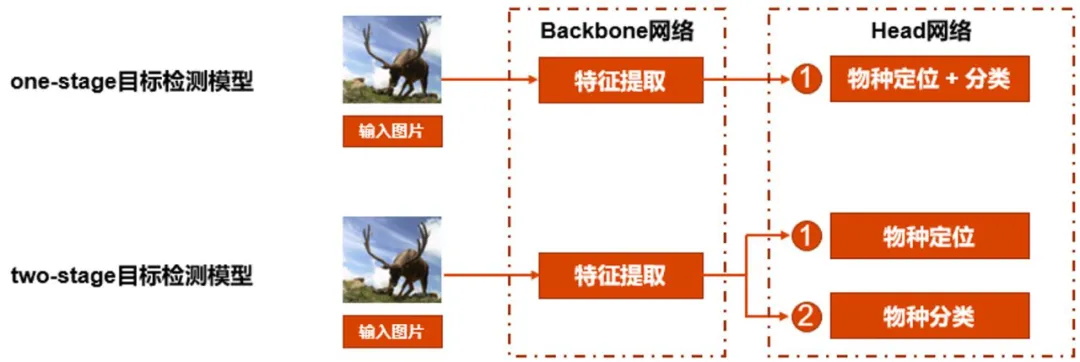 目标检测模型分为 one-stage 和 two-stage 两大类,两大类模型的共同点在于 Backbone 骨干网络都用于对输入图片进行特征提取工作,区别则在于 Head 网络,one-stage 模型在一个阶段即可完成对目标的定位与分类,而 two-stage 网络则是分两个阶段完成,先完成目标定位,再对定位的目标进行分类,即对输入的图片先通过滑窗得到几十万个的框,要求物体正好出现在一个滑窗中,这个滑窗的位置即为物体的位置。对于一张图片来说,存在大小各异的物体,这就导致设计的窗口大小也存在多种,这样耗费了大量的时间,然后再使用选择算法筛选出较符合的框,对这些窗口的目标进行分类,而 one-stage 则是基于整张图片的,它并不要求物体必须在这个框内,就不需要设计大小各异的框,只要求物体的中心落在这个框内即可,因此我们就可以先预测出 X 个框的分类,再通过置信度去筛选较可信结果。