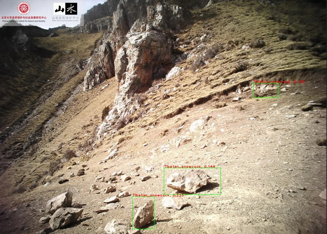 虽然模型仅训练了 10 个物种,对于其他三江源地区物种(如藏狐、兔狲、马麝等),模型也能检测出来 85% 以上的动物,其中多数被检测为同类物种,例如藏狐被检测为同为犬科的赤狐或狼,马麝被检测为同为有蹄类的岩羊或白唇鹿。