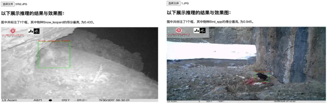 模型训练完成后,在 500 张的验证集上使用 COCO 官方 API 评测工具,比对检测标注框与实际标注框的 IOU 值,验证模型,整体验证结果良好,在不同阈值下(0.001-0.7)的 best mAP@IOU=0.5 在 82-92% 的范围内,整体的识别准确率在 82-97% 的范围内,其中阈值为 0.1 时识别准确率最高,仅有 1% 的漏检(未检测到动物)和 2% 的错检(检测为其他物种)。在阈值的选择上,采用的阈值越高,错检越少,但相对应的漏检会较多。在实际的使用场景中,为了避免出现漏掉拍到动物的照片,倾向于采用较低的阈值(如 0.1),AI 模型为照片标注多个框(或正确或错误)的结果,再由人工判别最终的结果。