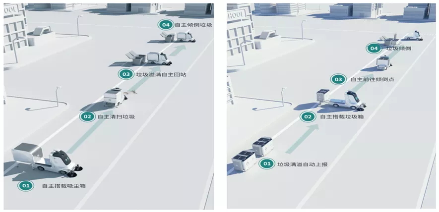 基于该解决方案,可实现覆盖式清扫和巡检清扫双工作模式,正式模拟环卫工作业模式,高效、高质量完成地面清扫作业。自动回充、自主倾倒,打破固有环卫形式,打造全链条无人化清扫服务。