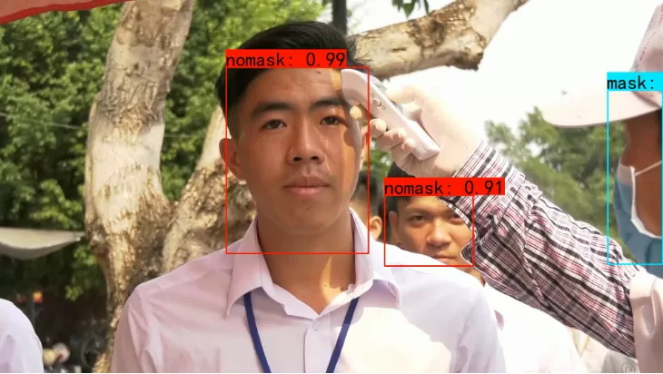 基于该解决方案,以QSENSE系统中不戴口罩识别为例,在华为Atlas边缘设备部署推理代码,可输出正确的预测结果,满足项目实际需求。