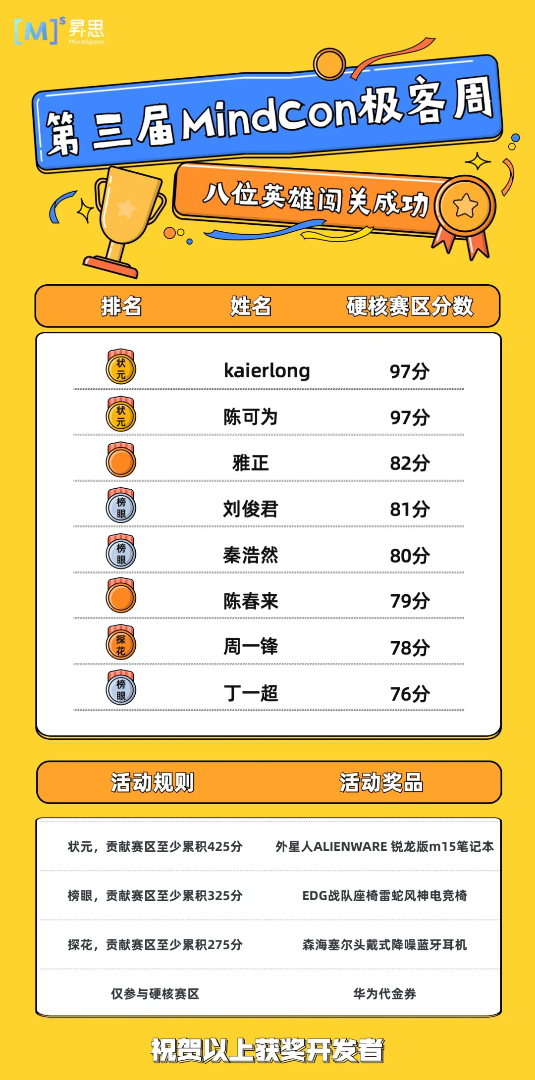 1、其他没有公布的参赛小伙伴可以联系小猫子(mindspore0328)获取详细获奖情况