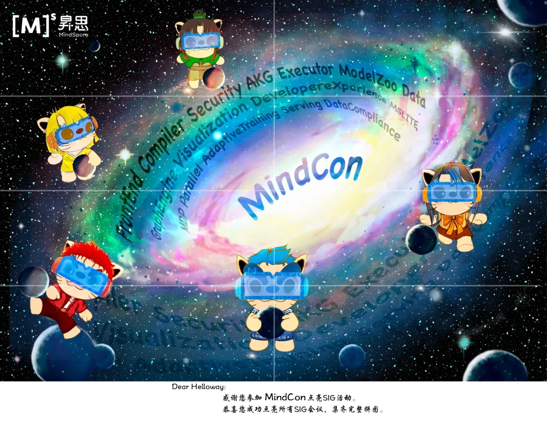本届MindCon极客周也首次发布了MindSpore超酷的人物IP形象—喵警局特战队,是由MindSpore专属设计师灵魂画手小桃子为小孢子们独家设计的盲盒娃娃,后续喵警局特战队也将会活跃在MindSpore各种活动中哦,若想集齐喵警局特战队全部特工,请持续关注我们~