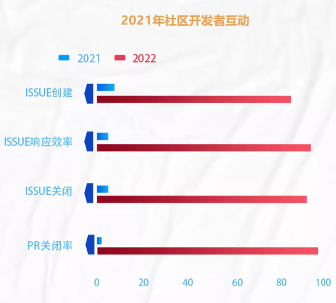 昇思MindSpore社区以开发者为中心,提供及时响应和需求开发服务。2021年社区ISSUE创建较2020年增长了75%,且ISSUE在创建第一时间由自然人响应效率提升86%。ISSUE与PR关闭率分别增长4.6倍、10.7倍。