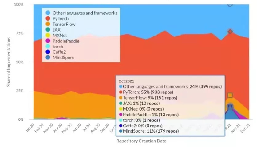 2021年共发表300篇顶级会议论文,根据Paperswithcode统计,仅10月基于MindSpore的AI论文在所有AI框架占比11%,排名全球第二。
