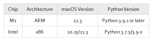 The following table lists the software and hardware supported by MindSpore for macOS. Due to Python's limited support for Apple M1, Python 3.9.1 or later is required for macOS running on M1.