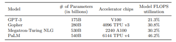 PaLM adopts a dense, decoder-only structure similar to GPT3 with 8B, 62B, and 540B variants. This model has the following modifications to the standard Transformer model architecture: