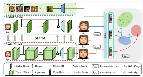 In this paper, the team designs a universal framework for SR model compression and acceleration via contrastive self-distillation (CSD), facilitating dynamic resource adjustment based on actual computing resources. At the same time, positive and negative samples are introduced to effectively restrict the perception space, so that the knowledge is explicitly transferred from the teacher network to the student network.