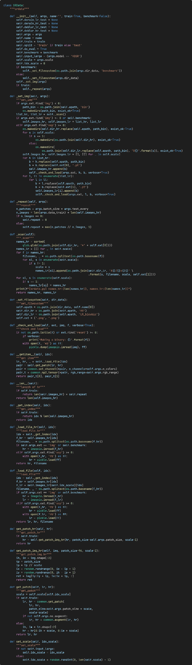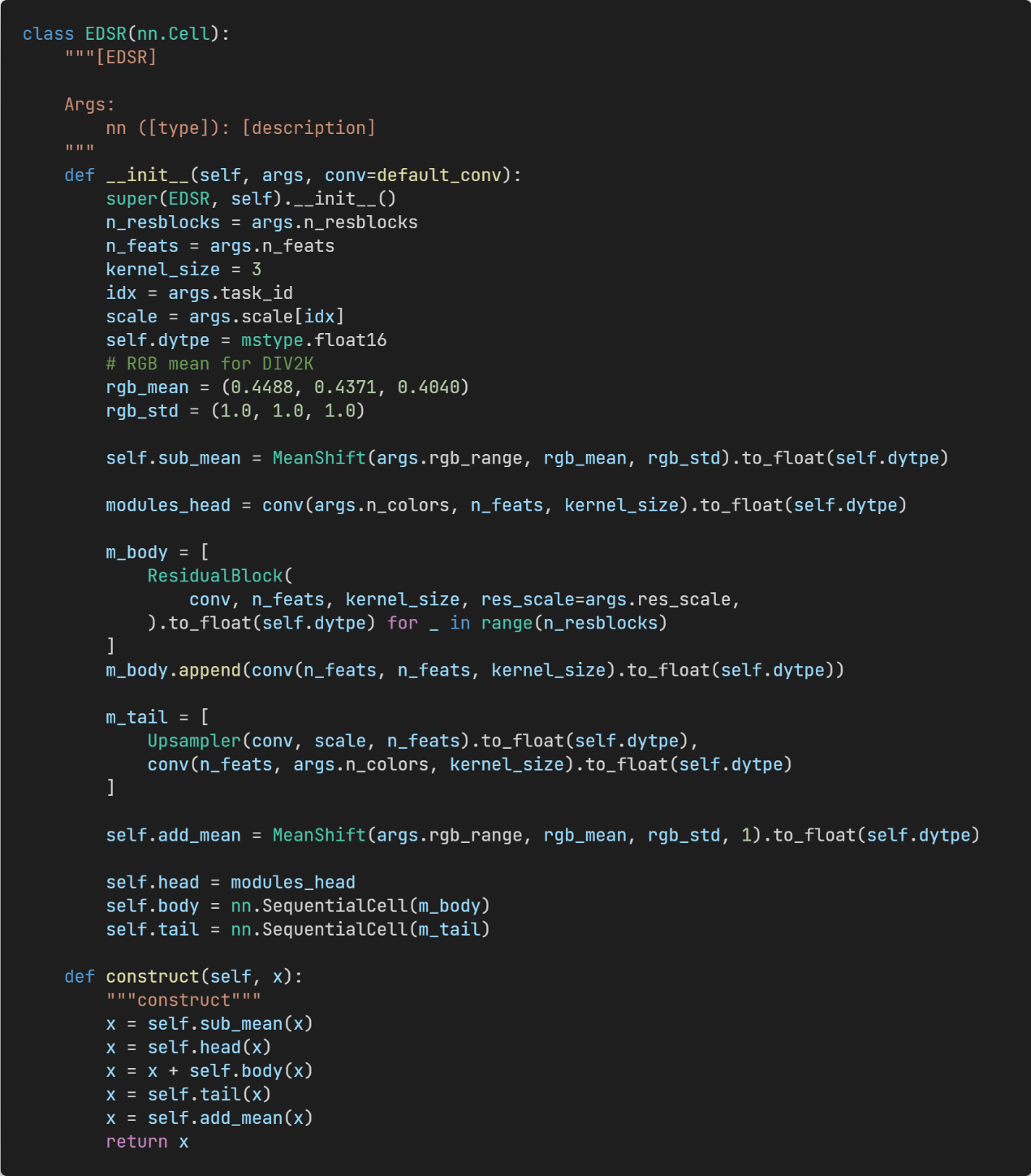 Key modules include the data loading module, network structure (the EDSR model is used as an example), loss functions, and trainer.
