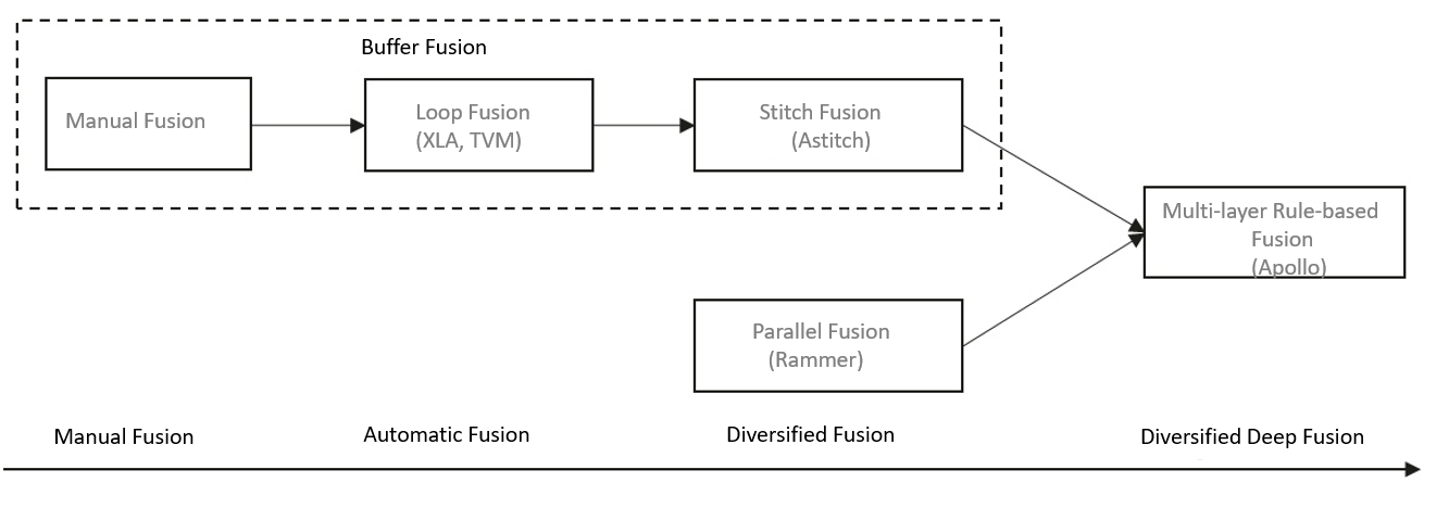 The rapid development of computing power, combined with Moore's Law restrictions, means that the memory and parallelism bottlenecks of AI processors will become more and more prominent. We designed Apollo to address these challenges. Apollo uses a multi-layer fusion architecture to combine different fusion modes, achieving significant fusion performance, as well as better scalability and elasticity.