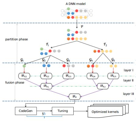 Prior to the fusion of hierarchical layers, the input computational graph is partitioned into micro-graphs. Each micro-graph serves as the basic unit for the operator schedule as well as the starting point for multi-layer fusion. In the Apollo architecture, fusion is done through three layers. Layer I uses the polyhedral automatic schedule technology to perform loop fusion and schedule optimization on each micro-graph. Layer II identifies the data-dependent operator intermediate representations (IRs) that can be stitched for fusion based on the IRs of fused operators. Layer III works with the IRs obtained at Layer II, identifying independent IRs and conducting parallel fusion based on parallel rules.