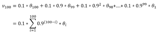 Based on the preceding formula, we can get an exponential decay function: 0.1, 0.1 x 0.9, 0.1 x (0.9)2, ...