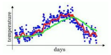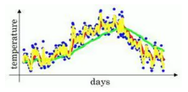 2. Assume that the value of β is close to 1, such as 0.98. 1/(1 – 0.98) = 50. The temperature of the past 50 days is averaged, as shown by the green line in the figure.