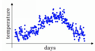This figure shows the relationship between time and temperature. The horizontal axis indicates a day in a year, and the vertical axis indicates the temperature of the day. The temperatures in January and December are lower than those in June and July.