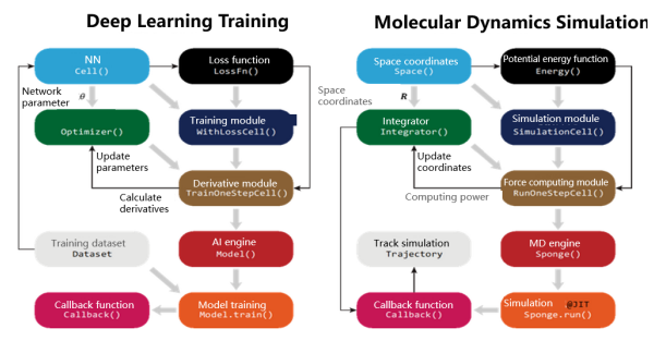 Google launched JAX-MD, an MD simulation software based on its JAX framework at the end of 2019. Some universities also developed TorchMD based on the PyTorch framework. In China, Professor Gao Yiqin cooperated with Huawei to develop the next-generation intelligent MD simulation software MindSpore SPONGE based on Huawei all-scenario AI framework MindSpore.