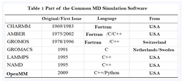 At present, MD simulation is widely used in chemistry, biology, physics, pharmaceuticals, materials and environments. Early in the 1960s and 1970s, molecular dynamics simulation programs for specific systems have emerged. After decades of development, many general-purpose MD simulation software has been available in the market. Table 1 shows some popular MD simulation software.
