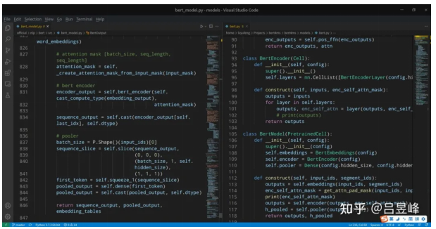 First let's look at the official implementation code (gitee.com/mindspore/models/blob/master/official/nlp/bert/src/bert_model.py). Even if we take out the code comments, the implementation is still complex and lengthy. Later, when I need to migrate the checkpoints from HuggingFace to MindSpore, I wrote a much shorter version myself. The official implementation example can surely be compressed, to hundreds of lines of code, as a matter of fact.