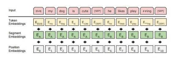 Segment Embedding: It is used to distinguish two different sentences of the same input, and added to perform the next sentence predict task.
