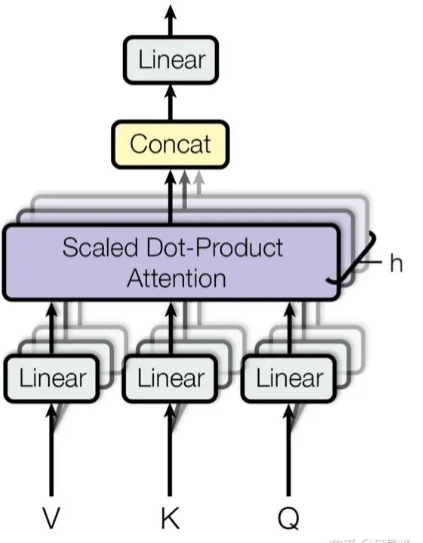 After completing the scaled dot-product attention, let's look at the implementation of the multi-headed attention mechanism. In fact, the original single Q, K, and V are projected into h Q's, K's, and V's. Therefore, the generalization capability of the model is enhanced without changing the calculation amount. The term may be interpreted as an ensemble of a plurality of heads in an ensemble model, or alternatively, as a convolution operation with multiple channels. To some extent, CNN was the inspiration for multi-head attention. The implementation code is as follows: