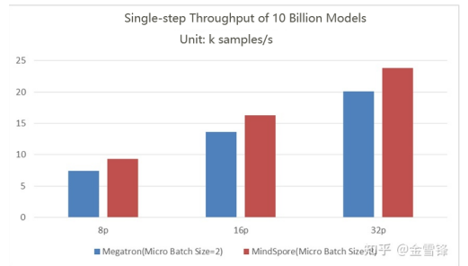 The maximum throughput of 32-processor Megatron is 20.1 k samples/s, and that of MindSpore is 23.8 k samples/s, which is 18% higher than that of Megatron.