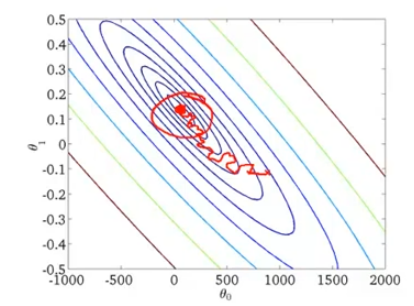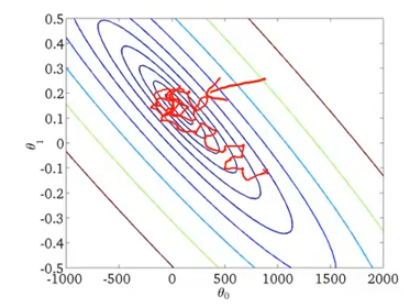 Instead of performing summation over all training examples, stochastic gradient descent scans through the training examples one by one and slightly modify the parameter θ accordingly. Multiple passes are performed before an iteration of stochastic gradient descent is completed. Of course, every coin has two sides. Not every iteration takes the parameters in the "right" direction. Although stochastic gradient descent generally moves the parameters in the direction of the global minima, the algorithm does not actually converge but wanders around continuously in a region close to the global minima.