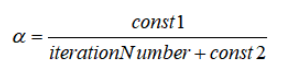 As the algorithm gets closer to the global minima, the learning rate decreases, allowing the algorithm to converge to the global minima instead of meandering around it. However, this approach requires you to tune extra parameters (const1 and const2) and is unnecessary in most cases.