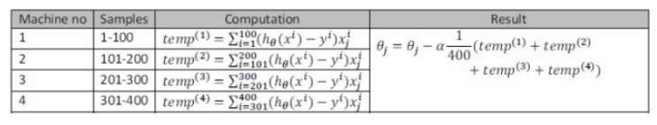 For example, for a training set of 400 examples, the task of computing the sums of functions of batch gradient descent can be distributed to four computers as follows: