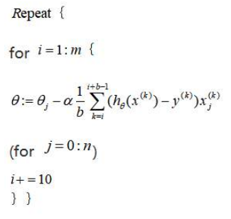 Mini-batch gradient descent is an algorithm in between batch gradient descent and stochastic gradient descent. In mini-batch gradient descent, b examples (the mini-batch size) are used in each iteration to update the parameter θ.