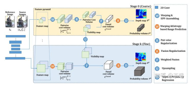 The Learning-based coarse-to-fine method mainly includes the following steps: two-dimensional feature extraction, cost volume construction, 3D regular expression, and depth result prediction. The EAM and ER modules of EPP-MVSNet focus on cost volume construction. The following figure shows the algorithm pipeline.