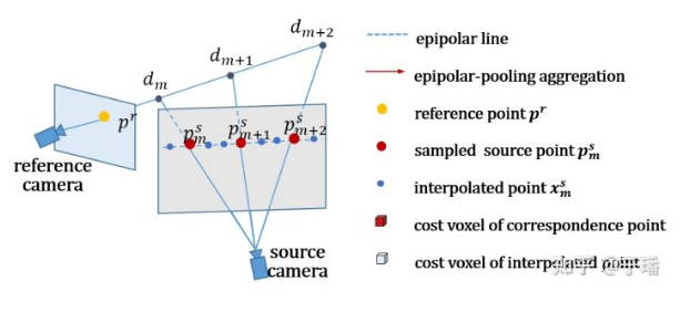 To solve this problem, EPP-MVSNet proposes the epipolar assembling module (EAM), which calculates the distribution of original sampling points on the auxiliary view in advance under the default depth assumption range, and inserts new sampling points adaptively according to the distribution interval. According to the distribution of sampling points generated by different spatial geometric relationships between the main view and different auxiliary views, EPP-MVSNet can adaptively maintain the density of sampling points and reduce the chance of missing key feature points.